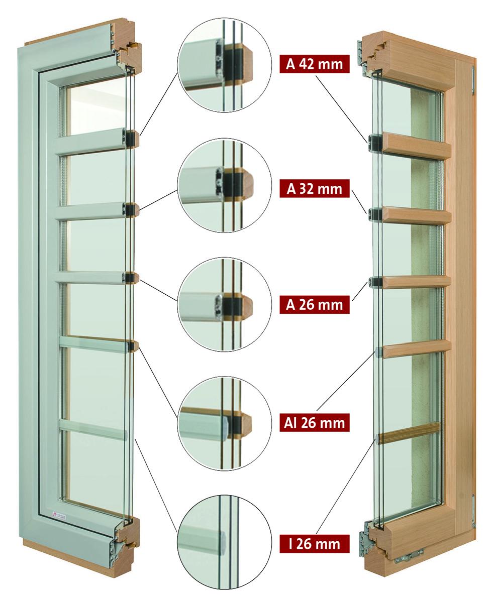 innenliegende Sprosse, 26 mm, außen in RAL beschichtet, raumseits aufgeklebte Holzsprosse - I26